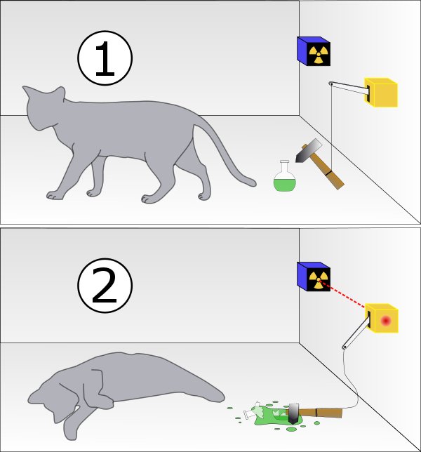 Suena ridículo. De hecho lo hes. Y es que este era el principal propósito de este experimento, demostrar lo ridícula que puede llegar a ser la física cuántica en ocasiones, y lo imposible que es intentar aplicarla al macromundo.